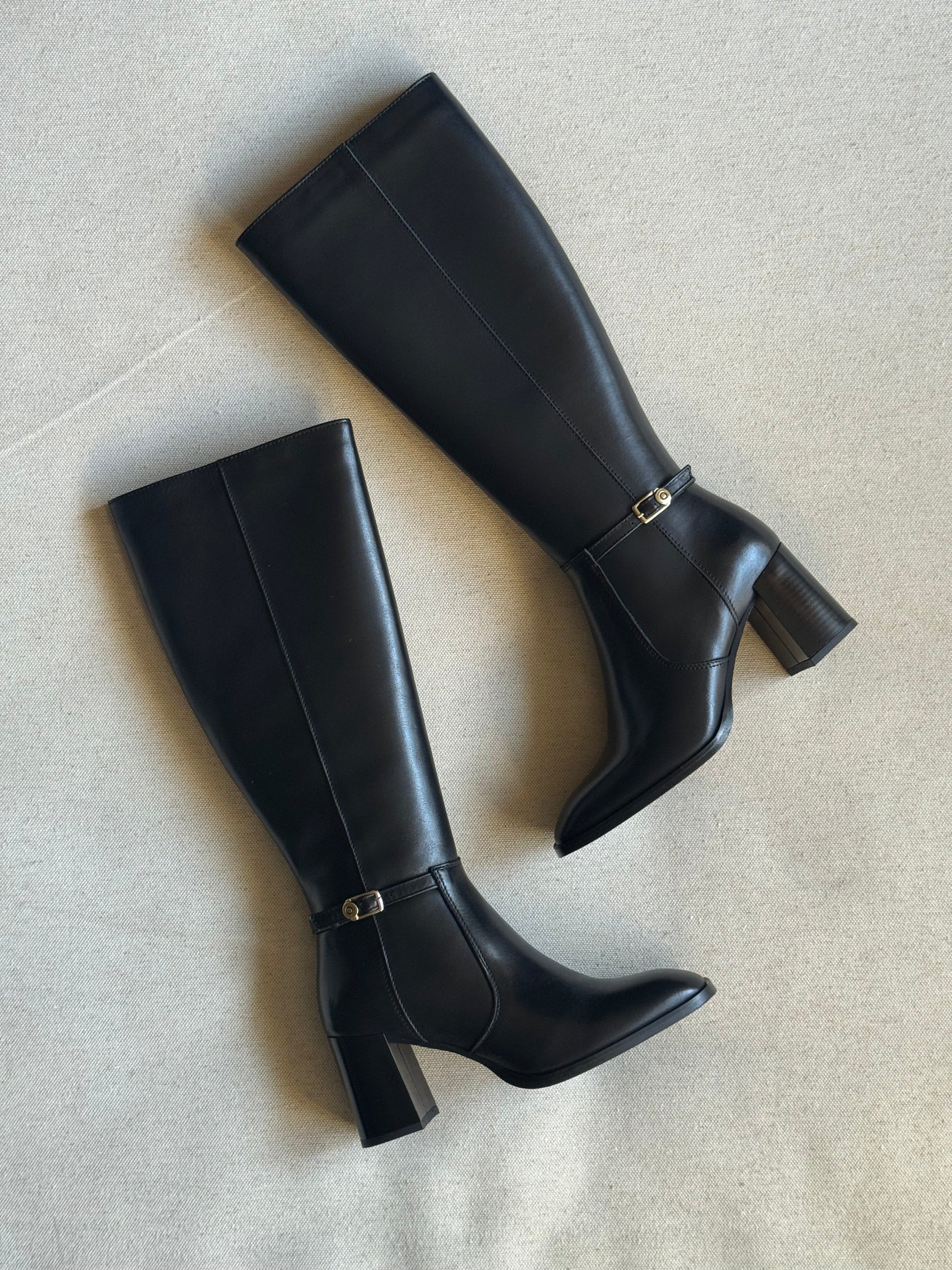 The La Paix Black knee-high boot by P&M embodies urban elegance. Crafted from smooth black leather, it features a clean, timeless silhouette with a subtle metallic accent at the ankle. The block mid-heel ensures long-lasting comfort and sophistication.
